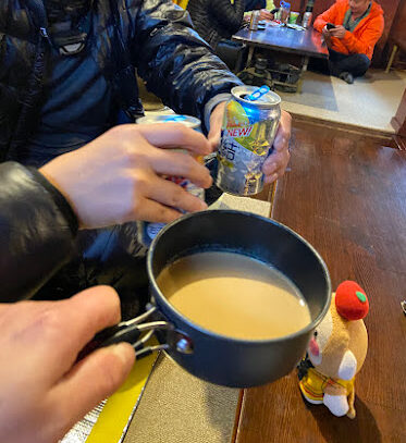 甲斐駒の七丈小屋には、年越しをここで楽しむ常連の方が多く、お互いに顔見知りのようで常連メンバーさんのテーブルは大盛りあがり。初参加の方やソロの方もいらっしゃり、こちらも互いにお喋りしながら飲んだりとみんな楽しく山で年越し。