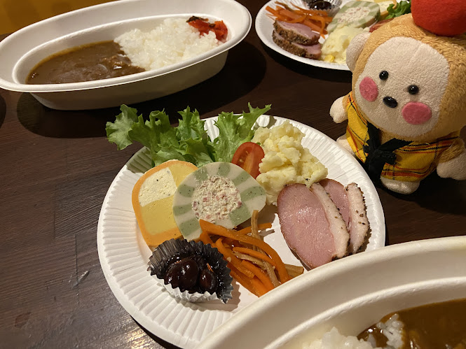 カレーライス、すき焼き煮、黒豆、いか人参、鴨ロース、ポテサラ、パテ風かまぼこ、野菜。彩りがいいのも素敵よねぇ、先生。