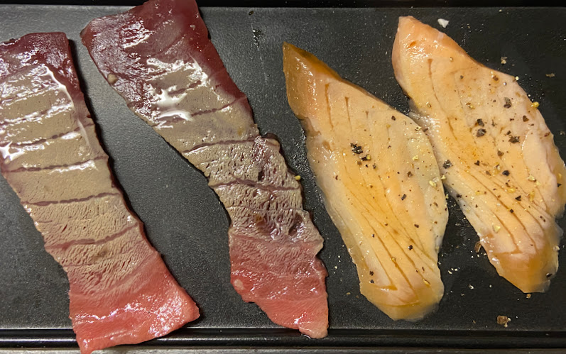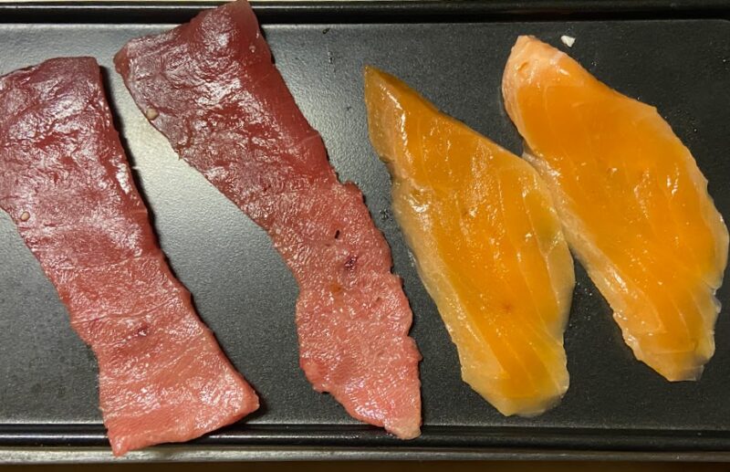 スーパーや魚屋さんで買ってきた刺し身がちょっと生臭いかな、と思う時でも、バーナーで炙るだけで臭みが抜けて断然美味しくなるのです。それと甘みが増して旨味が感じやすくなる。本当です。だからもおすけはスシローさんなど回転寿司屋でも炙りネタがある時は、生よりも断然炙りを選びます。