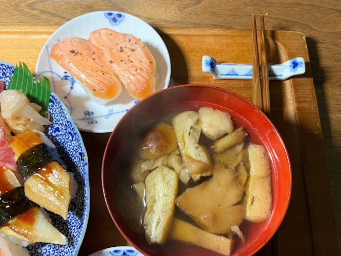 寿司といえばお吸い物よね。秋に採って冷凍してた、きのこでお吸い物も。