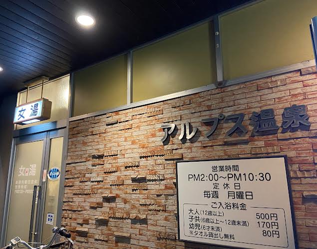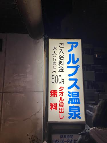 ここ、アルプス温泉は長野駅の繁華街のど真ん中にあります。ですが、作りは昭和の時代そのものの懐かしい風情。なんでも上は賃貸住居らしく、住人は温泉に無料で入れるようだ。