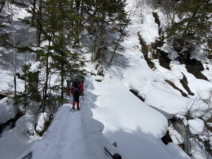 アイスクライミングでも行ったことあるけど、三本滝は行ったことないので楽しみです。で、マダムはスノーシューを、もおすけはワカンを履いて出発です!