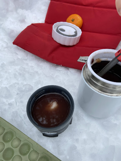 緩い冬山遊びは楽ちんで楽しい!などと思っていると、マダムが休憩にしましょ、と提案。するとマダム、なんとぜんざいを作ってきてくれていたのでした。